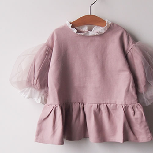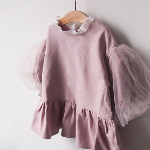 【メール便送料無料!】子供服 女の子 ワンピース 長袖 秋冬 70 80 90 スタンドブラウス チュール袖 ワンピース ピンク