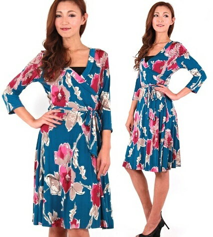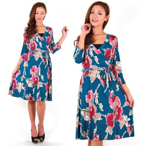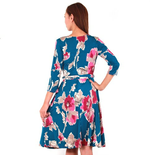 【メール便送料無料!】花柄 カシュクールワンピース ストレッチ 7分袖 ひざ丈ワンピース made in USA(ブルーグリーン)Mサイズ【 パーティー 二次会 ドレス ワンピース お呼ばれ 婚活 キャバ 】【メール便OK】