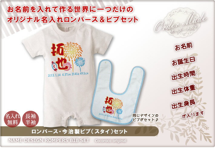 出産祝いに【名入れ無料】名前入り・半袖・長袖のロンパース&今治ビブ(スタイ/よだれかけ)セット・和風 花火 男の子 百日祝い 【メール便対応】 【ココロコ】