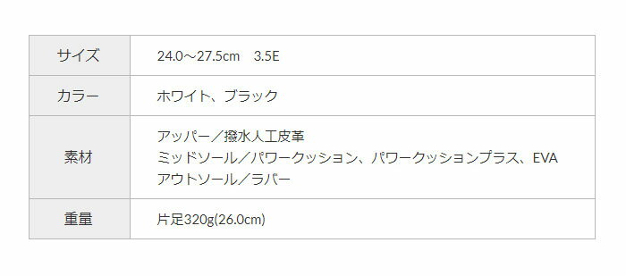 ■24.0〜27.5cm(3.5E 8サイズ) ■重量:片足320g(26.0cm) 素材 ■アッパー/撥水人工皮革 ミッドソール/パワークッション、パワークッションプラス、EVA アウトソール/ラバー 特徴 ■衝撃吸収材「パワークッション」搭載 ■軽量素材 ご購入の前にご確認ください ※在庫数更新のタイミングによっては実際の在庫状況との間にズレが生じてしまい在庫切れになっている場合もあります。
