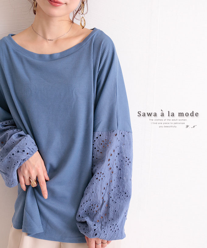 スカラップレースのぽわん袖トップス トップス レディースファッション カットソー 長袖 ぽわん袖 切り替え 異素材 レース ブルー 春 秋 冬 30代 40代 50代 60代 サワアラモード sawaalamode otona 大人 kawaii 可愛い 洋服 かわいい服 【8月19日8時販売新作】
